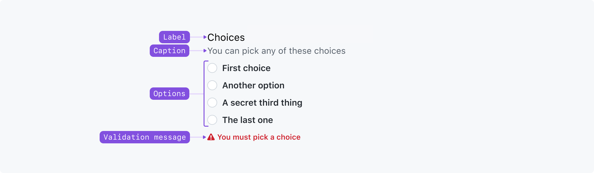 Label: A title that labels the group of options and helps users understand the relationship between the options in the group